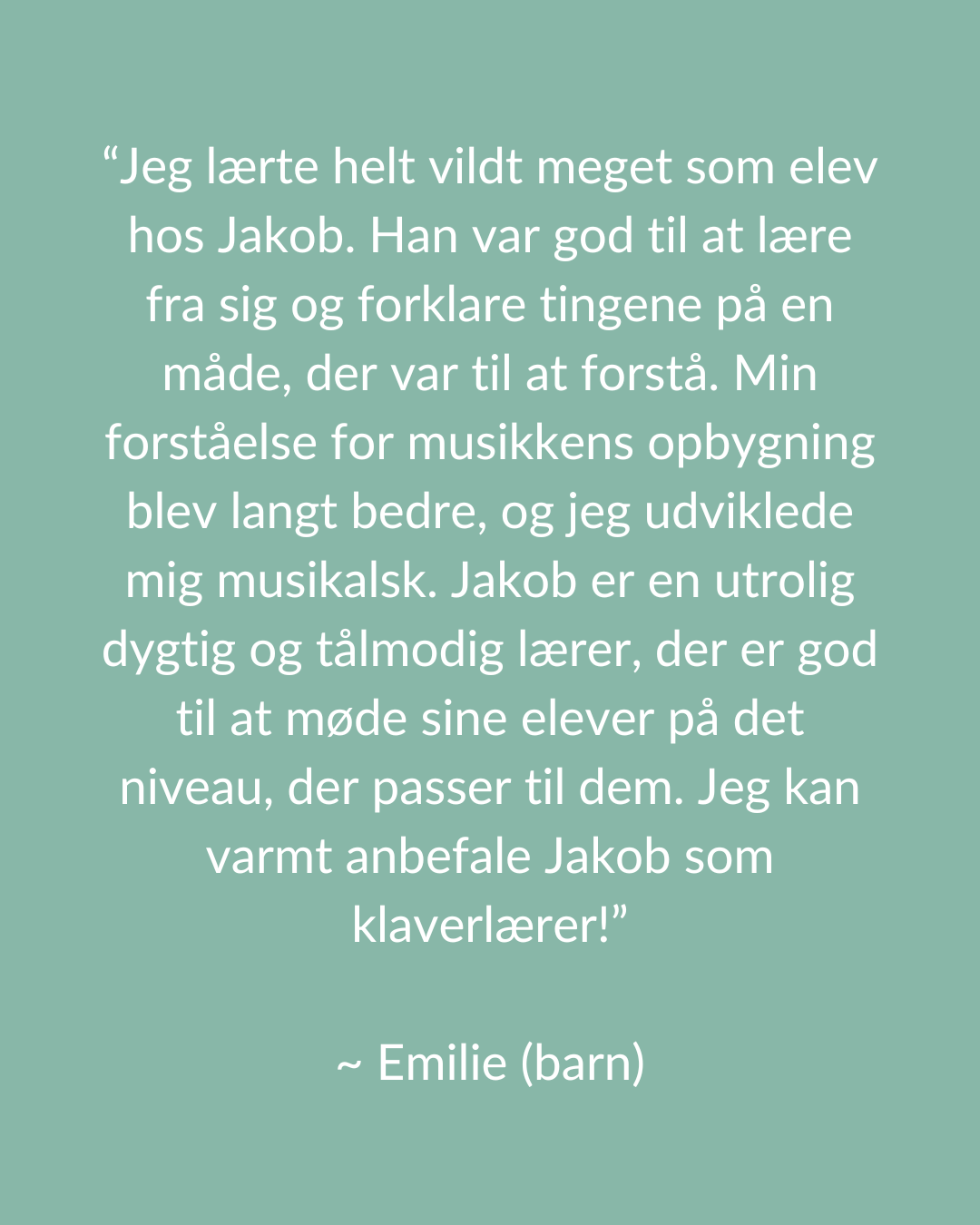 Som klaverelev hos mig vil man opleve, at musikglæden er i fokus, mens man opøver en bred palet af musikalske færdigheder. Mine elever sættes grundigt ind i nodelæsning, gehør, musikudøvelse og musikteori og har dertil rig mulighed for at få indflydelse på de sange og kompositioner, vi arbejder med.
