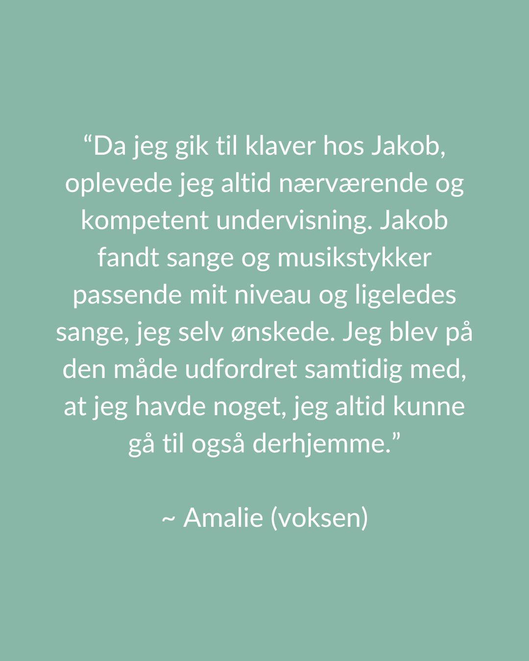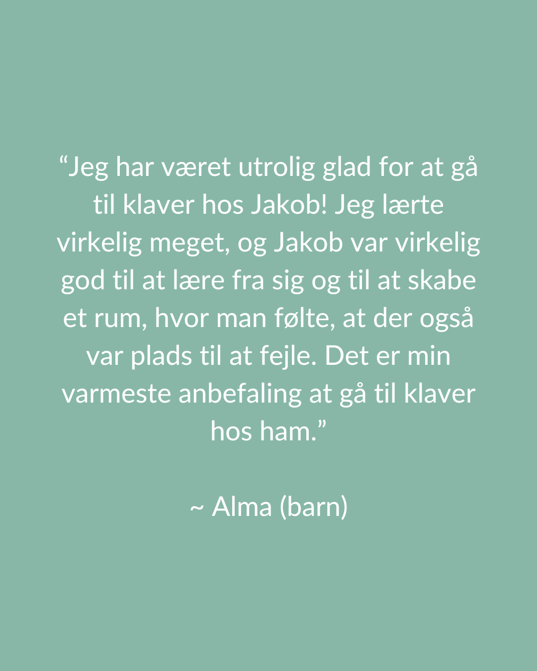 OBS: Klaverundervisningen er alene undervisning i musikalske færdigheder og har ikke karakter af psykoterapi eller musikterapi, medmindre andet eksplicit aftales. For at sikre klarhed om rammerne, gælder det desuden, at man ikke kan være i et samtaleterapeutisk forløb hos mig samtidig med, at man er klaverelev hos mig.