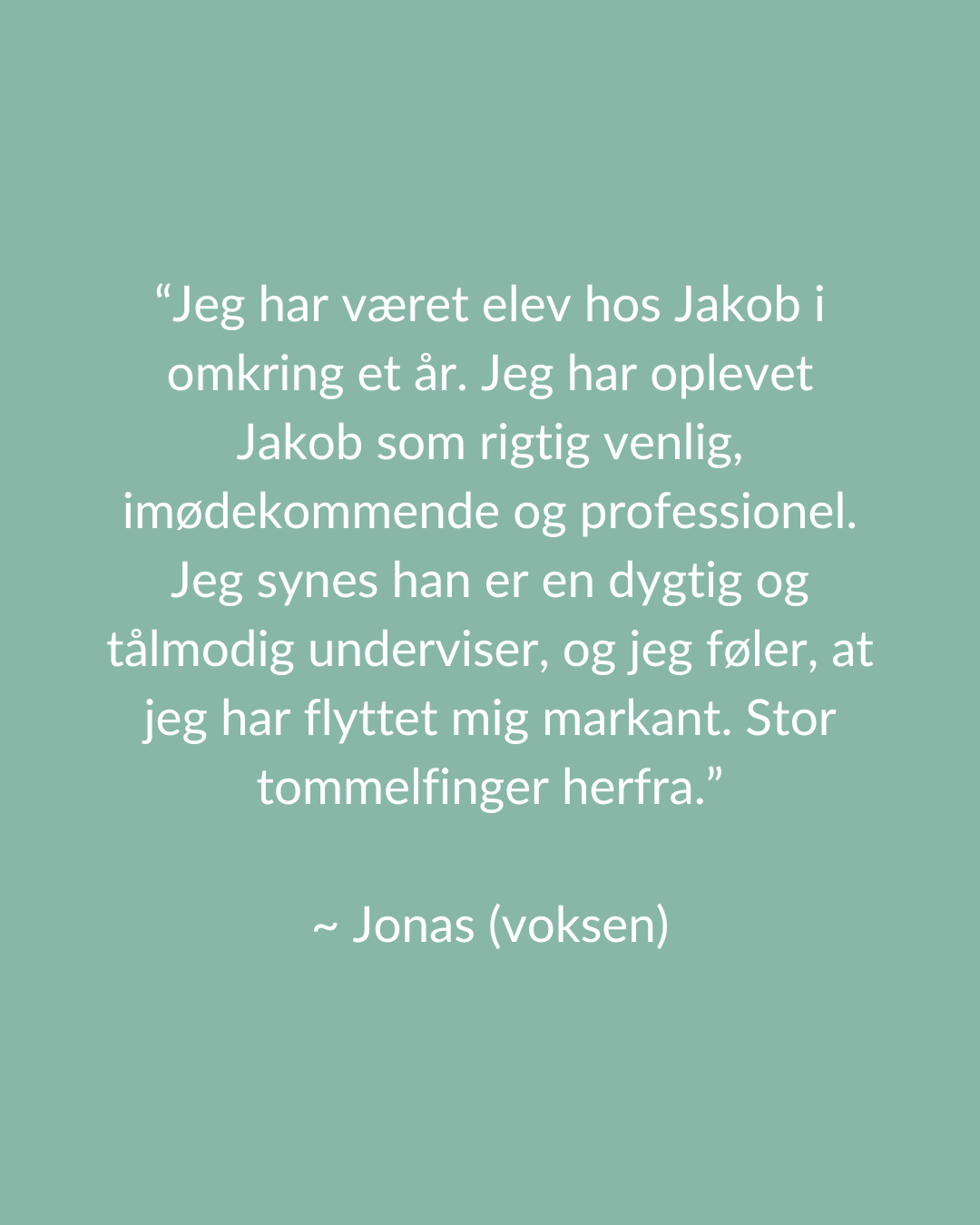 Jeg tilbyder sessioner a 30 minutters varighed og laver gerne en aftale om længevarende sessioner, hvis det ønskes. Jeg oplever, at 30 minutter passer bedst til de flestes behov, men nogle har stor glæde af f.eks. et ekstra kvarter. Tidspunktet for undervisningen vil som regel kunne tilrettelægges fleksibelt efter dit/jeres behov.